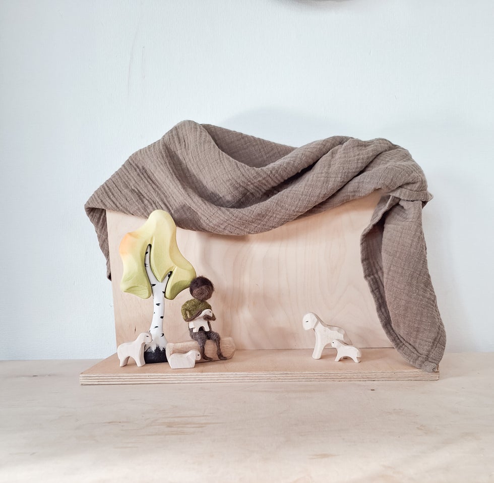 De jongens vonden het erg leuk dat er dit keer een jongetje op de seizoenstafel kwam! De schaapjes kreeg ik voor mijn verjaardag en Ethan blijft ze maar van de seizoenstafel pakken om er mee te spelen, dus vaak zit het herdersjongetje er alleen ;). Het hek met de zeis is een verwijzing naar de oogst.