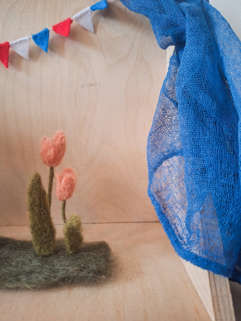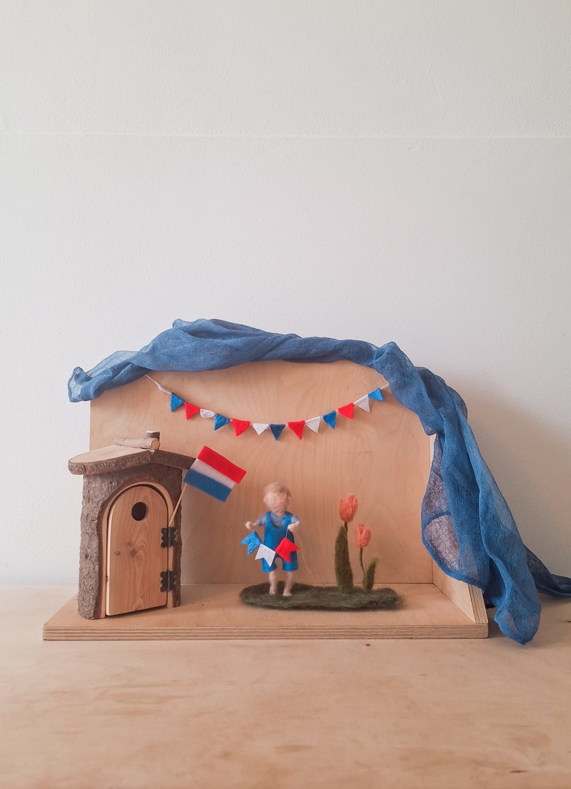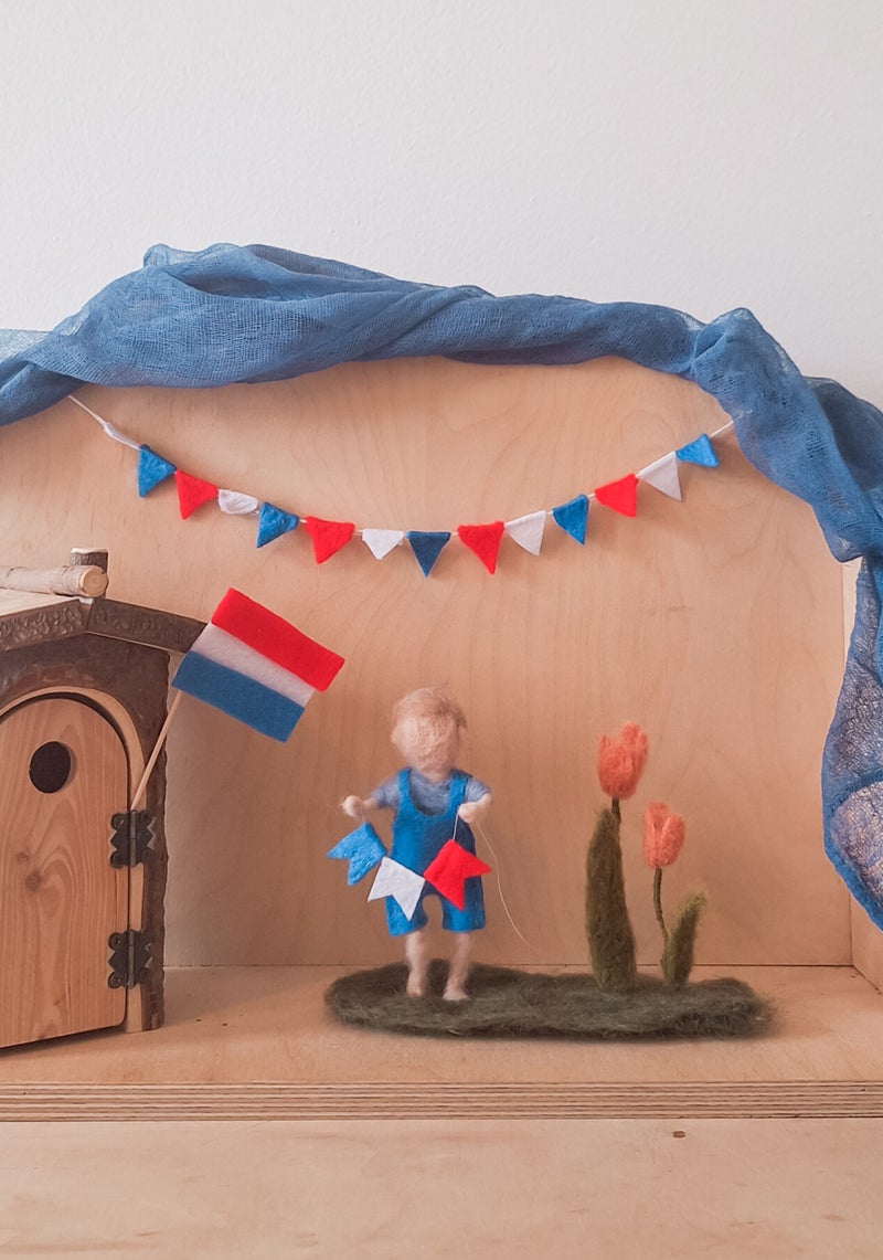 Ik gebruikte voor deze seizoenstafel voor het eerst de Ostheimer donkerblauwe doek als bekleding. Bij deze seizoenstafel vind ik het goed passen! Vorig jaar maakte ik een rood - wit - blauw vilten slingertje; die gebruikte ik nu als achtergrond. Het leuke huisje is van Kaboutervastgoed. Het kreeg een Nederlands vlaggetje. Het wolvilten jongetje en het groene matje met de oranje tulpen maakte ik zelf en was een leuk klusje!