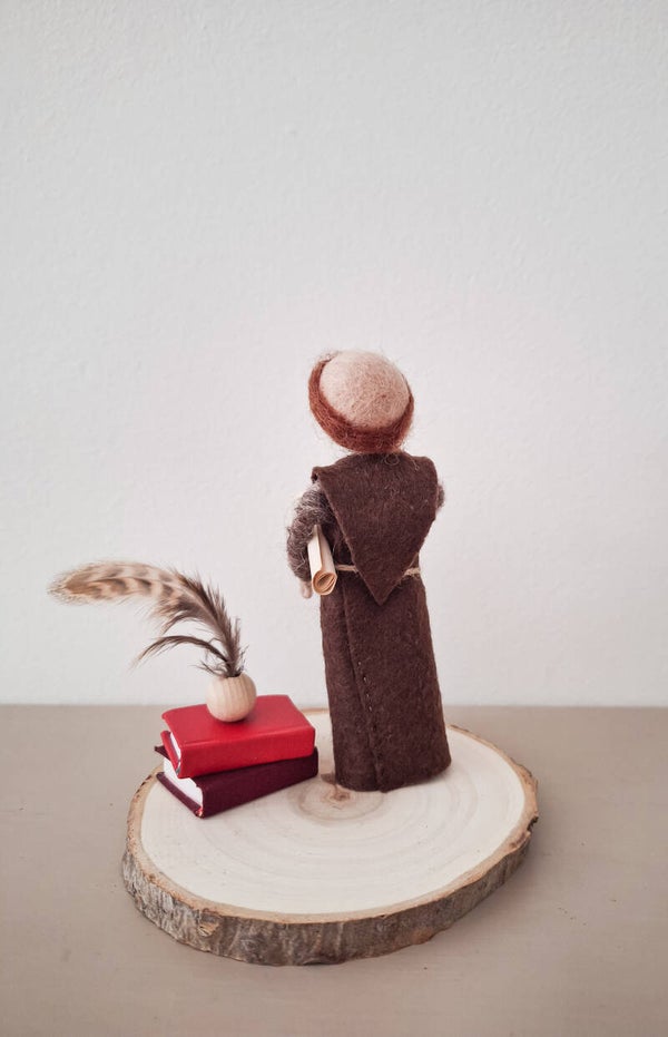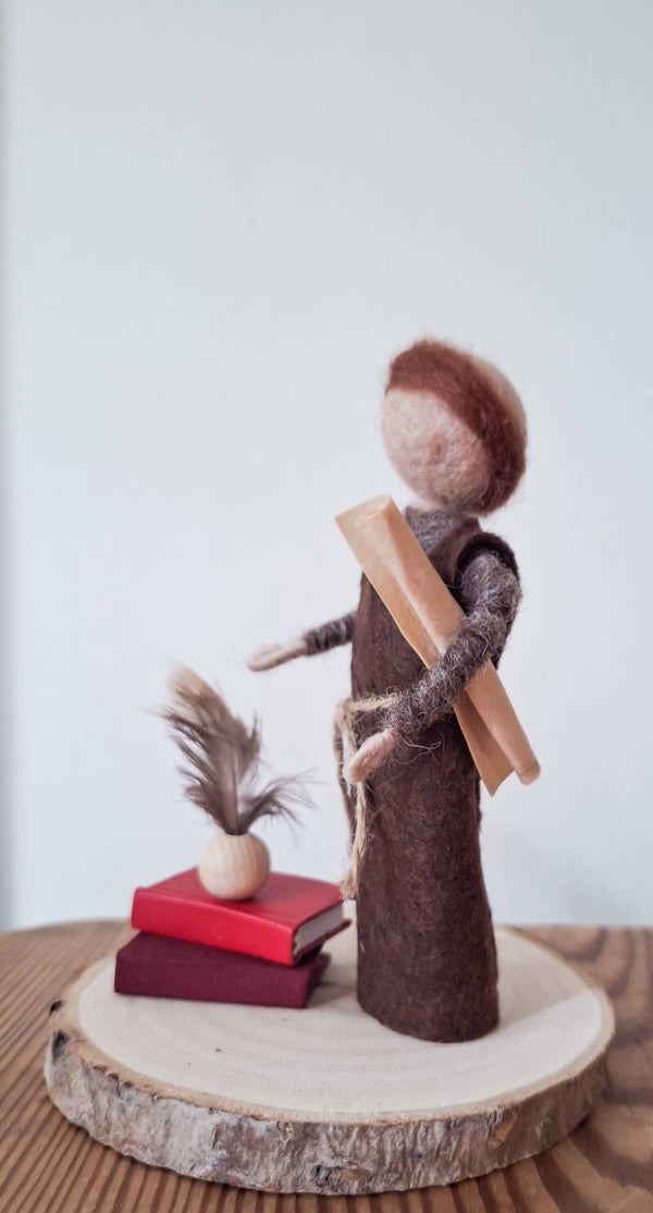 Monnik poppetje van wolvilt. Mooi voor de seizoenstafel voor hervormingsdag! Incl. Boekrol en inktpot met veer.